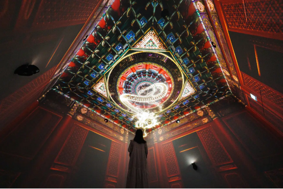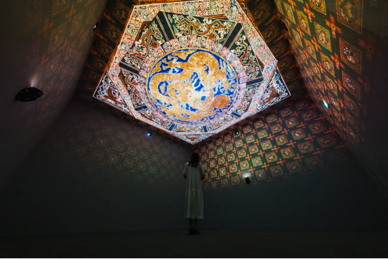 為了增強觀展體驗,部分展廳還融入了意想不到的設計元素。例如,一個展廳中央擺放著放大的瓷器復制品,內壁布滿隨風搖曳的花卉紋樣;另一個展廳則巧妙利用天花板空間,展示精美的藻井圖案與動態投影交織的奇幻景象。