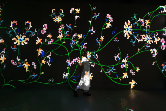 展覽運用數字技術重新詮釋了博物館收藏的建筑構件、陶瓷和刺繡藝術品,打造了七個獨特的展示空間。在這些空間中,從云間穿行的龍紋到庭院中嬉戲的貓影,靜態的紋樣被賦予了動態的生命。墻壁變成了活生生的畫布,為傳統紋樣揭開了新的維度。