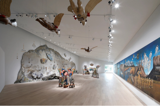 開幕展匯聚跨世代亞洲藝術家:除蔡國強、村上隆、徐道獲、赫里·多諾等國際巨星外,更囊括瑪莎·阿蒂恩薩、潘娜潘·尤瑪尼等中生代力量。作品分布于美術館展廳、咖啡區及戶外——既有蔡國強曾在古根海姆展出的經典狼群裝置《撞墻》的再現,也有為直島量身定制的新作。徐道獲在其持續創作的《樞紐》系列中,首次融入當地民居走廊元素;N.S.哈沙則將咖啡廳轉化為反映島嶼社會生態韻律的沉浸式壁畫空間。