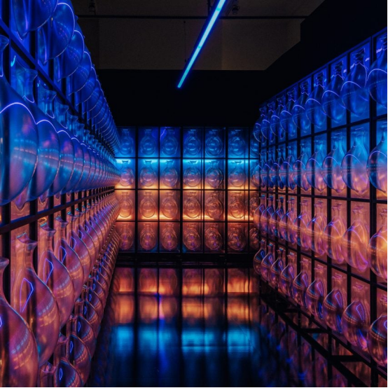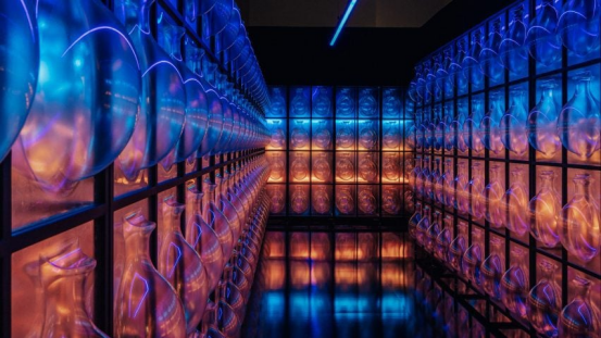 阿曼首次參展的作品以透明數控塑料復刻公元前三千年用于保存水等珍貴資源的傳統陶器。在模擬數據中心閃爍服務器的黑光燈照射下,這件裝置引發人們對網絡時代記憶保存所涉及的隱私與所有權問題的思考。該作品由Zawraq團隊與建筑師Haitham Al-Busafi聯合創作。