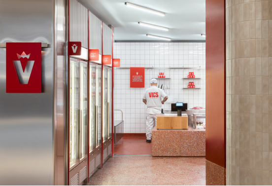 Platform by Design Office用紅色水磨石、不銹鋼和木材打造現(xiàn)代肉鋪新范式?;⌒蔚昝嬖O于購物中心內(nèi),多入口設計促進顧客互動。展示式肉案與模塊化布局,使該設計具備快速復制到新店址的靈活性。