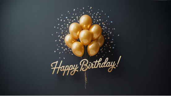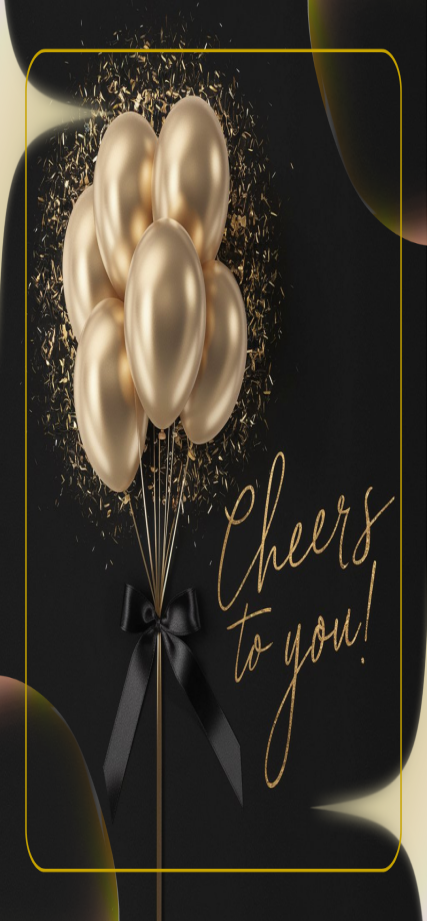 "現代風生日卡,黑色背景上的金色氣球與閃亮紙屑,極簡金色花體字'為你干杯!'"