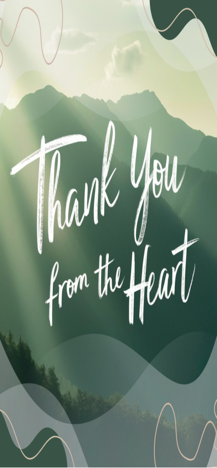 "感謝卡,陽光穿透山巒的風景畫,柔綠色調,手寫字'發自內心的感謝'"