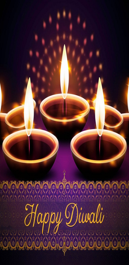 "排燈節賀卡,深紫背景上的閃耀油燈,傳統曼陀羅邊框,金色文字'排燈節快樂'"