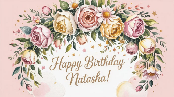 提示詞:生日賀卡,水彩玫瑰雛菊花束,淺粉漸變背景,金色優雅連筆字"娜塔莎生日快樂",溫暖歡快基調,高清畫質,居中文字,花卉主題
