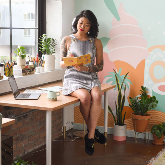 這位自稱"商業腦藝術家"的字體設計師現居底特律,以明快色彩、俏皮字形與古怪文案著稱。在紐約視覺藝術學院攻讀廣告期間,她將字體設計發展為職業方向。