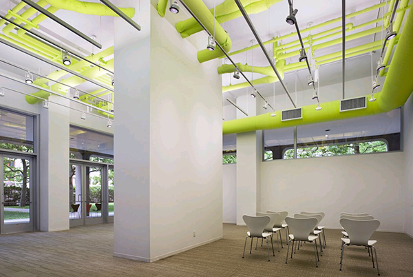 樓內(nèi)的公共走廊頂部采用了金屬網(wǎng)格吊頂,這種設(shè)計一方面能讓天花板保持通透感,便于空調(diào)、照明、電線等設(shè)備的維護和隱藏,另一方面,它也營造出一種簡潔、現(xiàn)代、工業(yè)風(fēng)的視覺效果,與整棟建筑的現(xiàn)代主義風(fēng)格相呼應(yīng)。