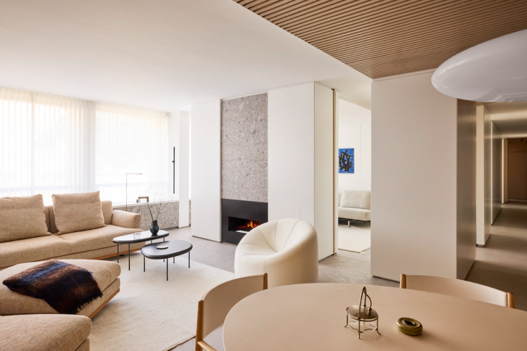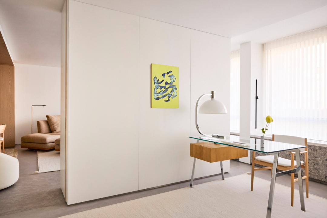 比如,這套公寓的主人是一對來自紐約大學(xué)的醫(yī)生夫婦,他們和三個孩子曾住在樓里的兩個獨立一居室單元。隨著孩子們長大離家,他們希望對空間進行重新規(guī)劃,以適應(yīng)新的生活需求。于是,找到了 Uli Wagner 設(shè)計實驗室,開啟了一場創(chuàng)意改造。