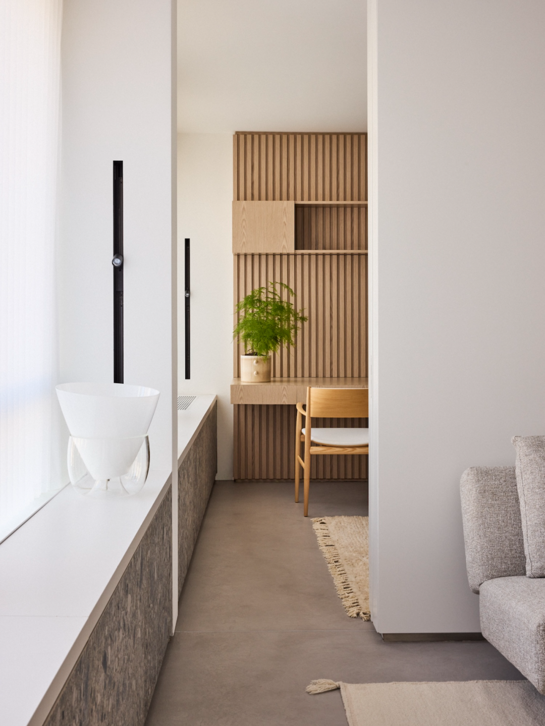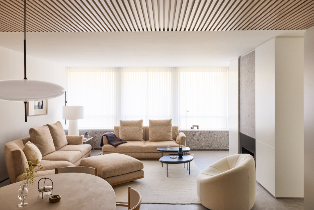 改造的第一步,是將兩個單元合并成一個連通的空間。設(shè)計師巧妙地利用了一個正式入口來連接兩個原本獨立的區(qū)域。入口處采用了梣木面板進行裝飾,這種材料的重復(fù)使用讓整個空間在視覺上更加連貫統(tǒng)一,也增添了一份溫馨感。