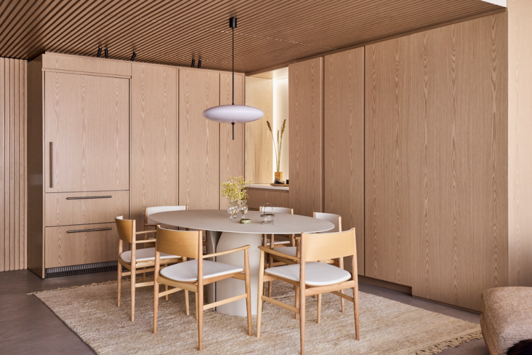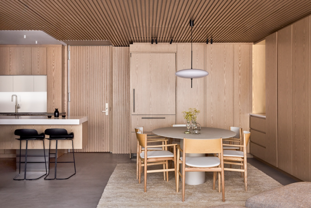 餐廳與廚房以開放式的布局連為一體,僅通過巧妙的空間過渡進行區(qū)分。看起來不像傳統(tǒng)設(shè)計那么“功能化”,這種設(shè)計不僅讓空間顯得更加開闊,還增加了家庭成員之間的互動性。