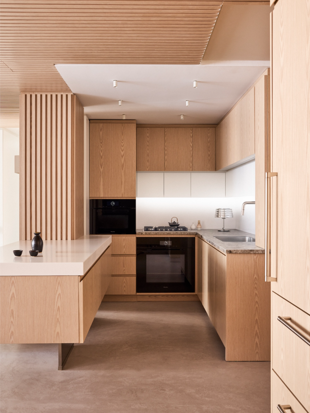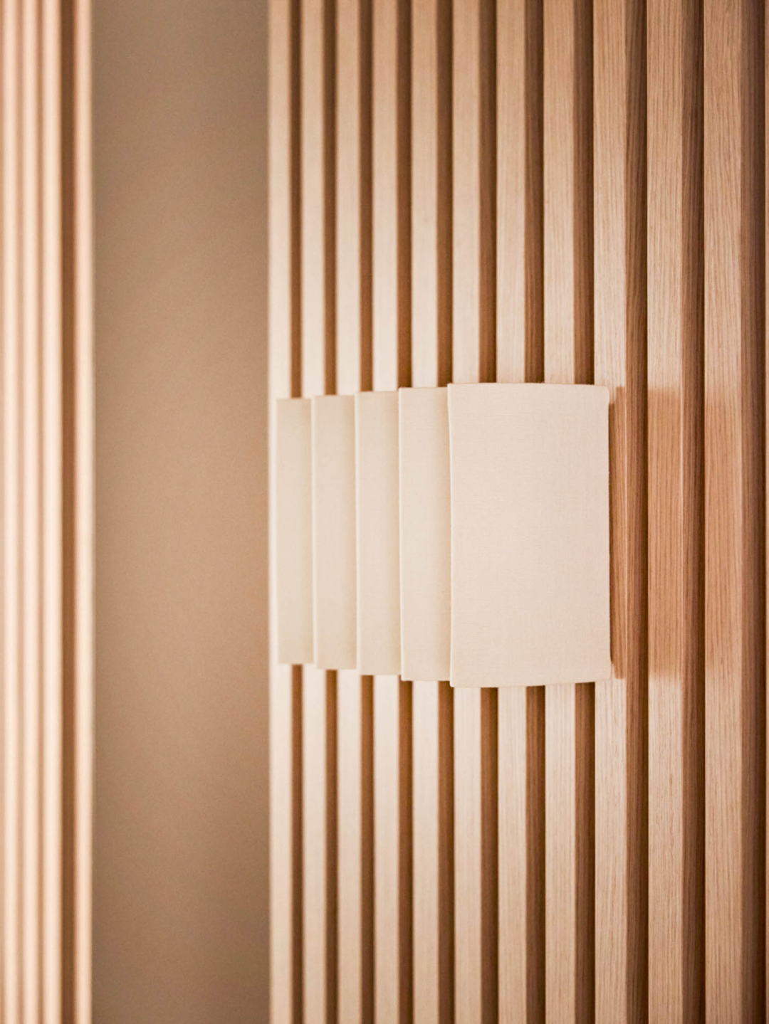 Humanscale 壁燈造型貼合條木飾面,打開時光線柔和、不刺眼,為走廊營造出一種溫馨寧靜的氛圍。