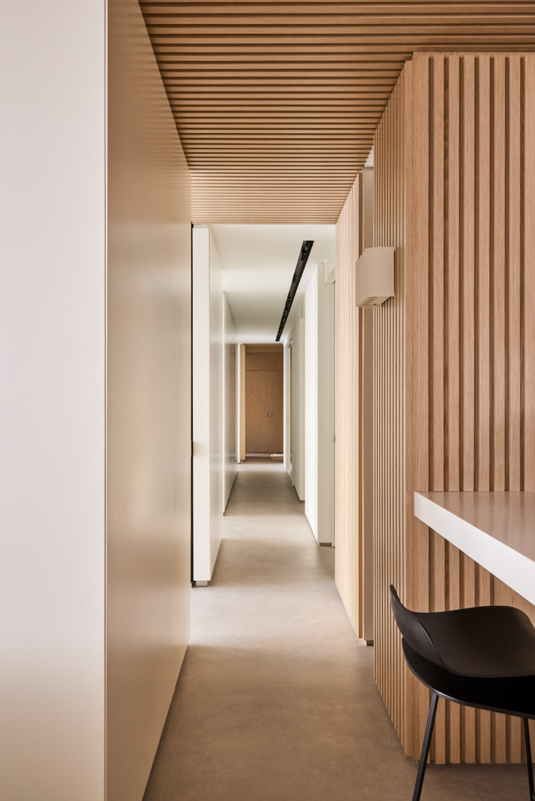 翻新后的走廊設(shè)計延續(xù)了整套公寓簡約而溫暖的風(fēng)格,墻面一側(cè)采用溫潤的木質(zhì)飾面,既統(tǒng)一了整體空間語言,又為空間增添了自然的質(zhì)感。