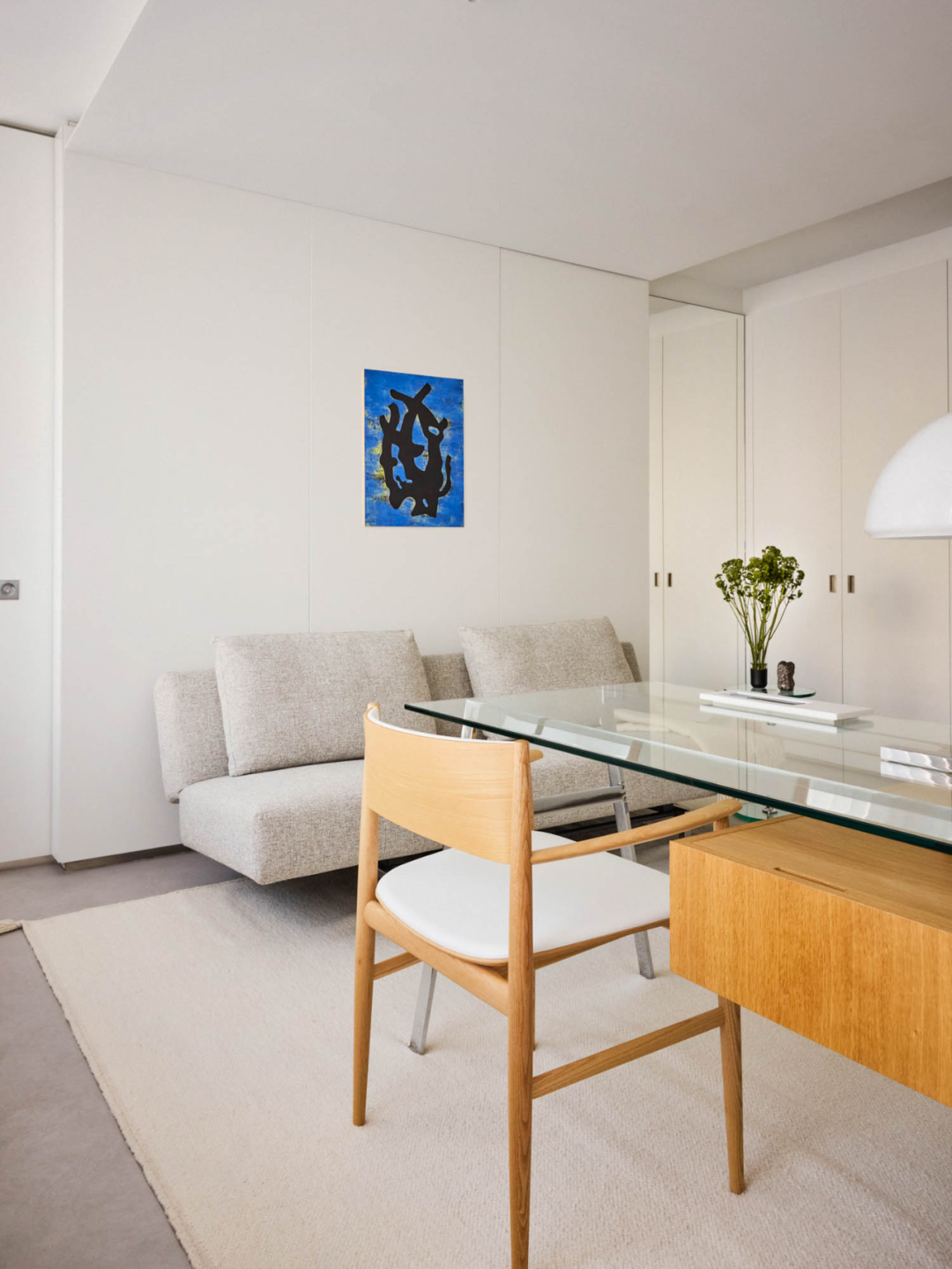 書桌和沙發(fā)床均由 Bense 定制打造,線條簡潔,結(jié)構(gòu)穩(wěn)重,體現(xiàn)了對工藝和品質(zhì)的重視。墻上懸掛的?Leo de Goede 畫作為空間注入藝術(shù)感和視覺焦點,增添了一種靜謐而富有格調(diào)的氛圍。