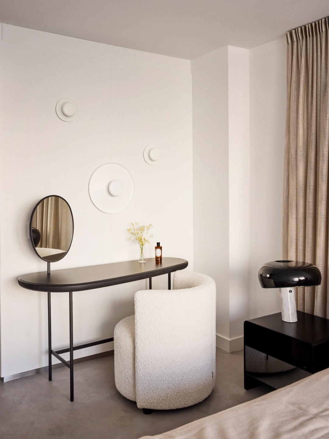 在主臥室的設(shè)計中,選用?Vibia 壁燈懸掛在?Living Divani 梳妝臺上方,提供了柔和的光線的同時又增強了空間的層次感。Flou 床頭柜也與臥室整體的清新氛圍完美契合,既不搶眼,又能為房間增添一份舒適感。