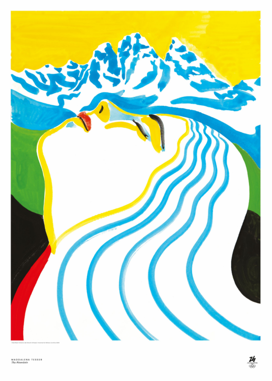 泰瑟運(yùn)用奧運(yùn)五色構(gòu)建視覺(jué)語(yǔ)言:女性軀體與多洛米蒂山脈名峰蒙特克里斯塔洛融為一體,發(fā)絲化作雪道軌跡,象征冬奧會(huì)中人與自然的神性交融。