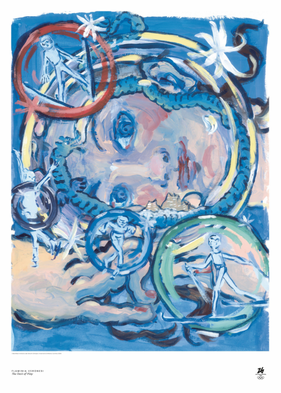 在這幅超現(xiàn)實(shí)混合媒介作品中,懸浮人物被解構(gòu)的奧運(yùn)五環(huán)環(huán)繞。巨龍形象致敬米蘭城徽" biscione"蛇,龍背馱著的正是冬奧會(huì)舉辦地科爾蒂納的多洛米蒂山巒。