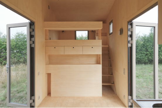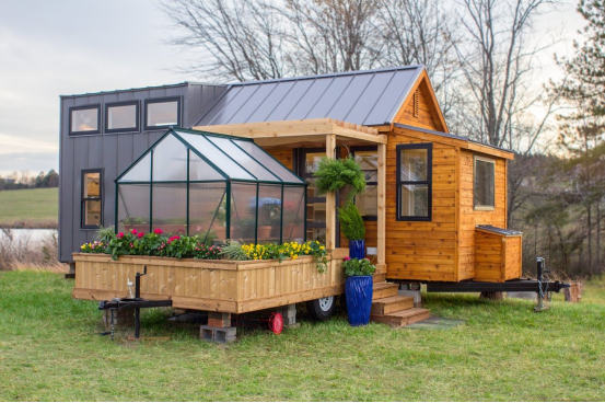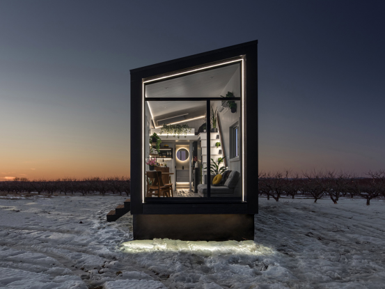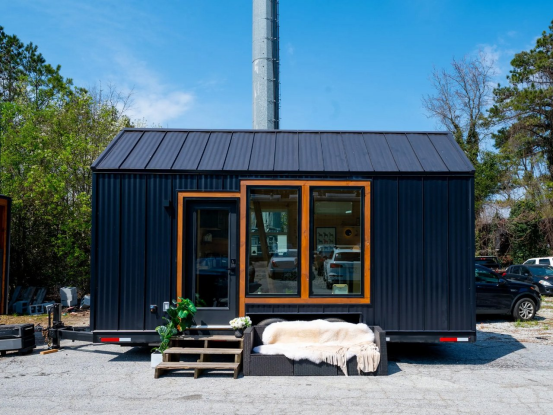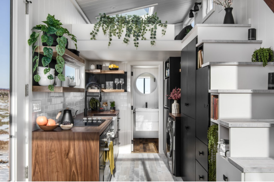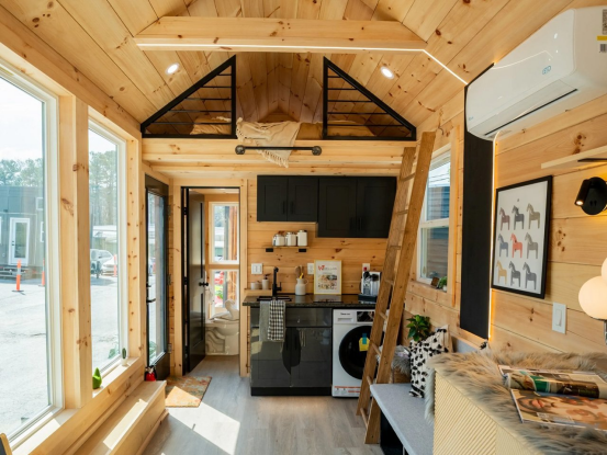 Dragon Tiny Homes打造的凱米2025以垂直木飾面與黑色窗框構建幾何美感。內置儲物與可變家具讓開放式布局靈活高效,淡雅色調與充沛采光詮釋了北歐設計的實用溫度。