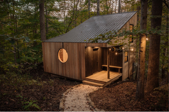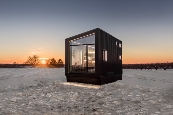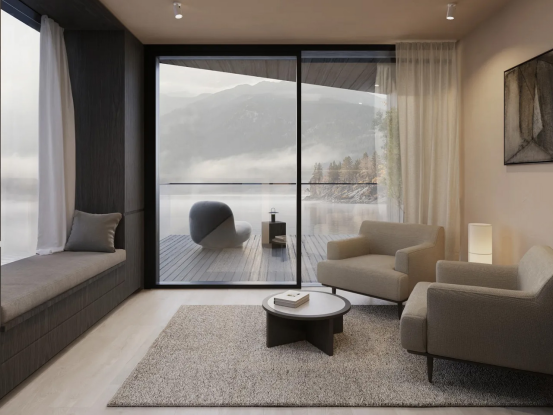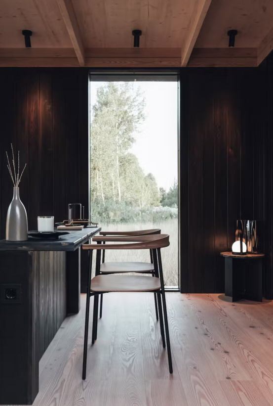 諾肯小屋以預制模塊技術打造未來感度假空間。深色耐候材質外墻低調隱入環境,全景玻璃幕墻將自然變為動態壁畫,內置折疊家具實現小戶型的奢侈體驗。