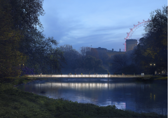 福斯特建筑事務(wù)所的獲勝設(shè)計(jì)方案通過(guò)連接傳統(tǒng)與現(xiàn)代的橋梁,聚焦于女王的一生。其核心理念是如何將這兩種特質(zhì)融合在一起。方案包括兩座紀(jì)念門、兩座花園,以及一座靈感源自女王婚禮頭飾的新橋,這座橋?qū)⑷〈フ材匪构珗@現(xiàn)有的藍(lán)橋。