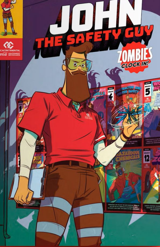 這家美國西南地區最大的可口可樂裝瓶商,委托Trace Element以生動形式向員工傳達14條安全準則。團隊去年創作了漫畫風格海報,今年更進一步推出"噩夢僵尸"劇情漫畫書,將安全手冊納入新員工培訓包。