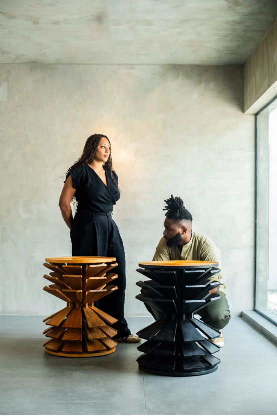 家具設計師托魯·魯法伊2018年在霍華德大學攻讀建筑時,便開始構建自己的文化設計圖譜。他坦言這條道路充滿挑戰,卻也賦予作品深刻意義:"創作根植于文化身份的設計,承載著重大責任。每個階段都強化了我的使命感。"他的代表作《帕特沃椅》靈感來自約魯巴文化中象征團結與掌聲的傳統發型,既具實用功能,也是文化宣言。另一件《藏貝托邊桌》則通過螺旋層疊的木鰭片,再現了貝寧傳統面具舞的動感韻律。