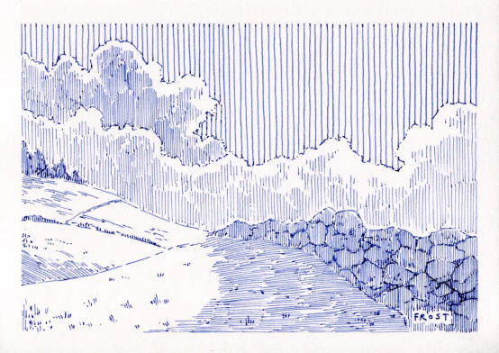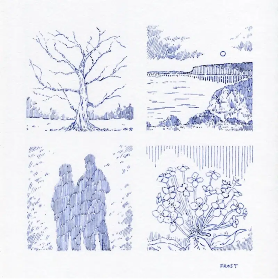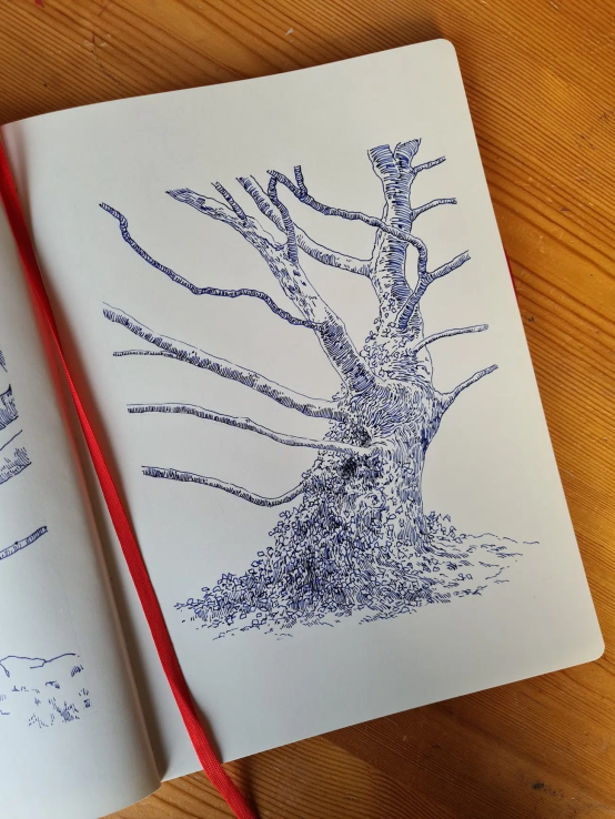 從周遭風景中汲取靈感,弗羅斯特用鋼筆與藍墨水在素描本上記錄下自然的沉思瞬間。"我常自比為'視覺喜鵲',既癡迷于流云掠過山川的壯闊,也沉醉于途中易被忽略的精微細節,"他在接受My Modern Met采訪時說道,"作為自然的忠實觀察者,我通過鋼筆素描將這些轉瞬即逝的片段凝固在紙頁上。"