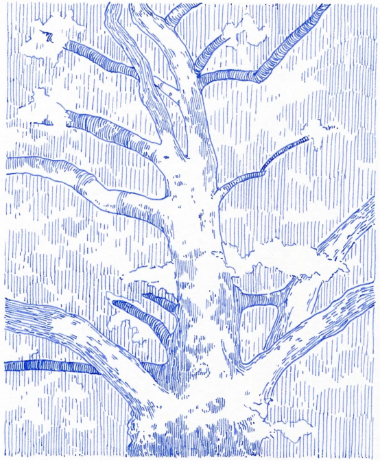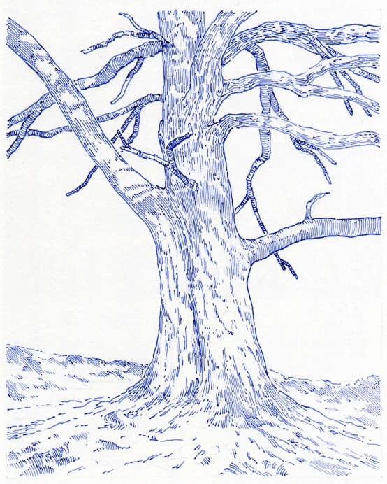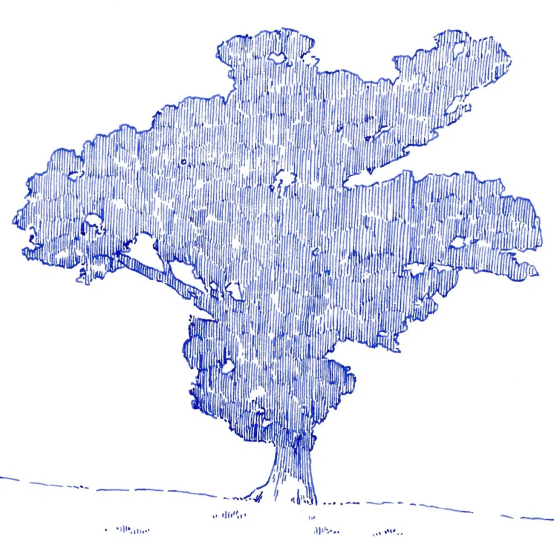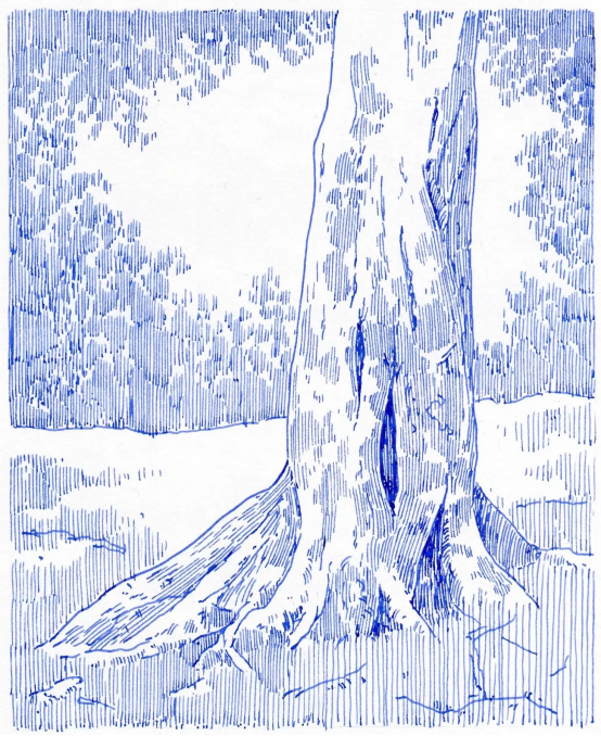 這種寧靜的冥想感不僅屬于創作者,更從畫作中自然流露,如漣漪般撫慰觀者。一位網友在評論中寫道:"你畫中的簡約感宛如詩歌。"這種視覺"詩性"體現在他反復描繪的樹木主題中——通過無數細密線條構建的斑駁樹皮、虬曲枝干與繁茂葉片,展現出驚人的表現力。