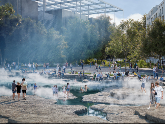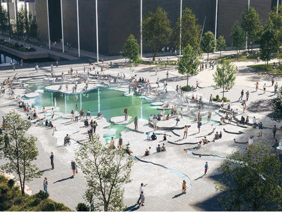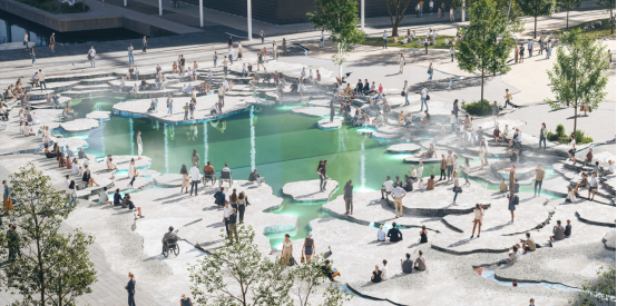BIG的方案中,三大廣場(chǎng)在統(tǒng)一敘事下各具特色:DR音樂(lè)廳廣場(chǎng)將水景重構(gòu)為城市泳池與露天劇場(chǎng),階梯座椅與浮島提供休憩空間,回收鋪裝材料被編織成環(huán)繞光水溪流的平臺(tái);貝拉競(jìng)技場(chǎng)廣場(chǎng)通過(guò)下沉式綠色"房間"營(yíng)造私密感,茂密植被與石材表面形成溫暖微氣候,攀援植物沿建筑立面垂直延伸裂痕意象;皇家競(jìng)技場(chǎng)廣場(chǎng)以隕石狀藝術(shù)裝置為起點(diǎn),金色裂痕橫跨街道,最終在雕塑化城市凹地形成聚集空間。