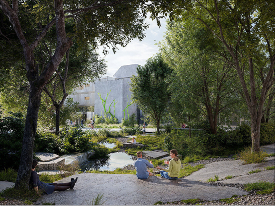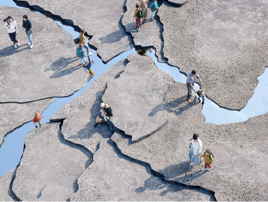 BIG的方案摒棄了"增加城市表面"的傳統(tǒng)思路,轉(zhuǎn)而通過(guò)"削減"手法揭開(kāi)并激活地層。設(shè)計(jì)師打開(kāi)地面,讓光線、水流與自然元素激活廣場(chǎng)空間,將濕地、本土植物與公共藝術(shù)融入連續(xù)環(huán)境中。一條雕塑般的"裂痕"如地質(zhì)斷層線貫穿場(chǎng)地,串聯(lián)三個(gè)廣場(chǎng)。這道發(fā)光的切口成為連接組織,將碎片化的城市表面轉(zhuǎn)化為統(tǒng)一的公共領(lǐng)域。