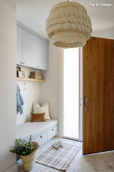 [Fig St. Design]為加州圣克魯茲的這處入口注入輕盈海岸風(fēng)情。木質(zhì)鑲板門搭配透光側(cè)窗,陽光透過白色船型墻板灑落在軟墊儲物長凳上。淡藍(lán)色壁柜提供額外收納,木質(zhì)展示架與門框相呼應(yīng)。六邊形耐磨地磚輕松應(yīng)對從海灘歸來的沙粒與拖鞋。