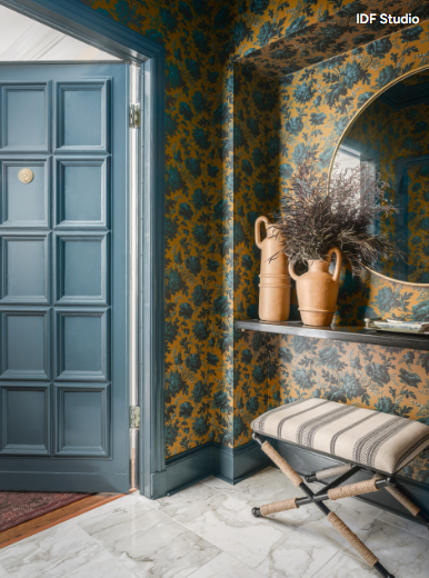舊金山這處入口經(jīng)[IDF Studio]改造,大理石地面、高光藍(lán)墻與復(fù)古花卉壁紙碰撞出珠寶盒般的驚艷效果。設(shè)計(jì)師在有限空間內(nèi)兼顧視覺沖擊與實(shí)用功能——保留鑰匙收納與換鞋區(qū)的同時(shí)毫不妥協(xié)設(shè)計(jì)感。