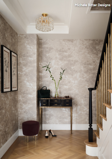 紐約復(fù)式公寓業(yè)主希望入口如全屋定制細(xì)節(jié)般獨(dú)特。設(shè)計(jì)師[Michele Bitter]以魚骨拼地板、阿瑪尼壁紙與黃銅樓梯扶手為基底,搭配流光吊燈、隱藏式儲物間及皮質(zhì)換鞋凳,實(shí)現(xiàn)低調(diào)奢華。