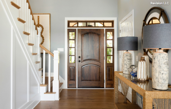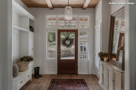 奧斯汀西湖山莊的寬敞入口中,[Audrey Scheck]通過整體壁柜、木梁天花與雕花門框演繹現(xiàn)代農(nóng)舍風(fēng)。玻璃木門及側(cè)窗將室外景致框入視野,功能性衣帽間暗藏巧思。