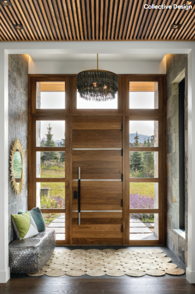 科羅拉多布雷肯里奇的這處入口,[Collective Design]用條木天花、石墻與金屬長凳呼應(yīng)山地景觀。垂直窗框與側(cè)窗既實(shí)現(xiàn)被動(dòng)式采光,又將雪松林景引入室內(nèi),流蘇吊燈成為視覺焦點(diǎn)。