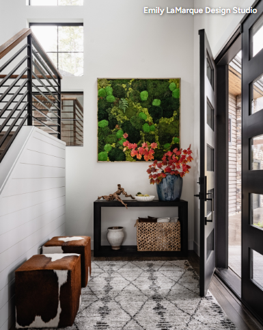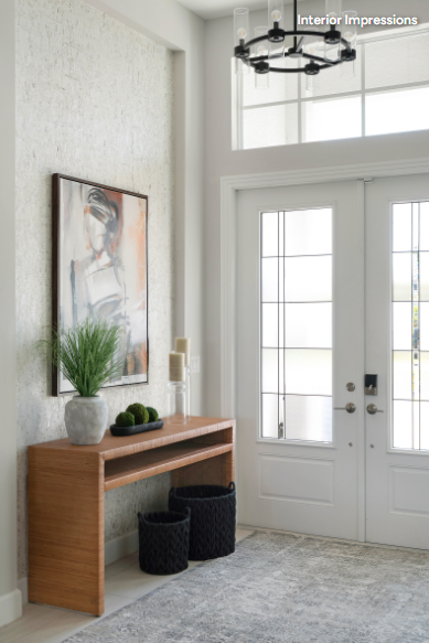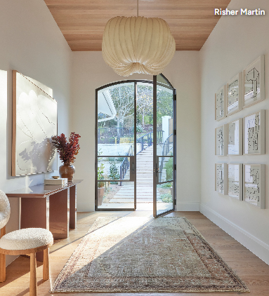 德州西湖山莊的項(xiàng)目中,[Risher Martin]將露天門廊改造為明亮玄關(guān)。定制鋼玻門取代厚重木門,高光漆玄關(guān)桌、藝術(shù)畫作與宣言式吊燈,在有限空間打造美術(shù)館般的儀式感。