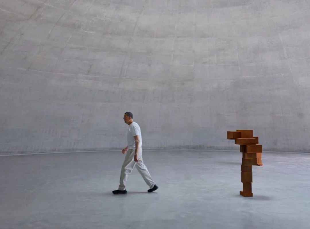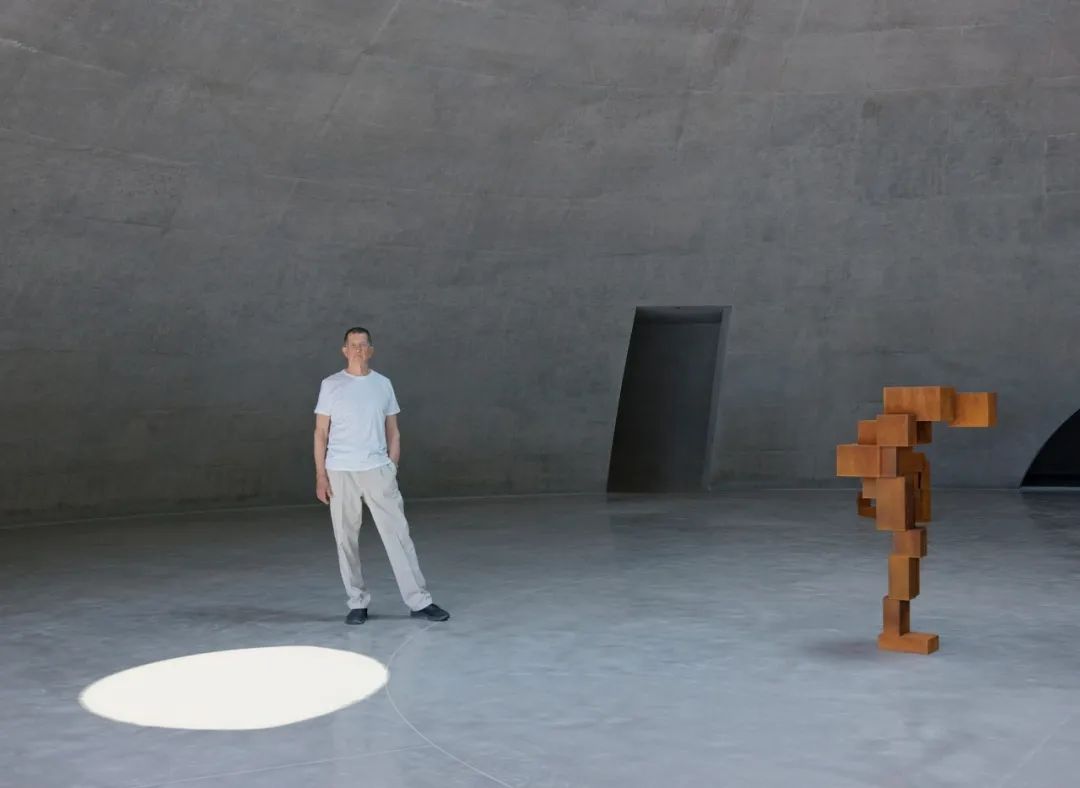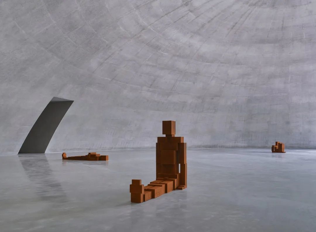 展廳內陳列葛姆雷“Blockworks”系列的七座生銹鑄鐵雕塑,姿態各異,置于圓頂邊緣及中心,一如雕塑“感知之地”,呼應光影、空間組織與混凝土質感。安藤“隱形建筑”的理念與葛姆雷體素語言形成共鳴,共同探討空間與身體的關系。