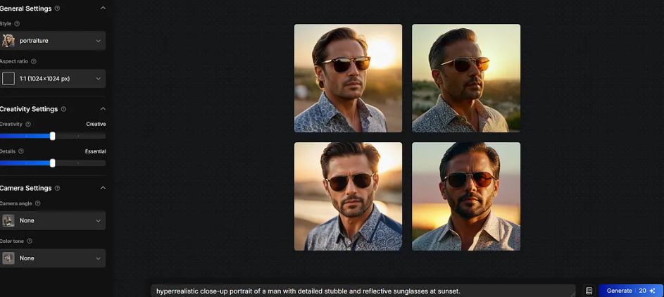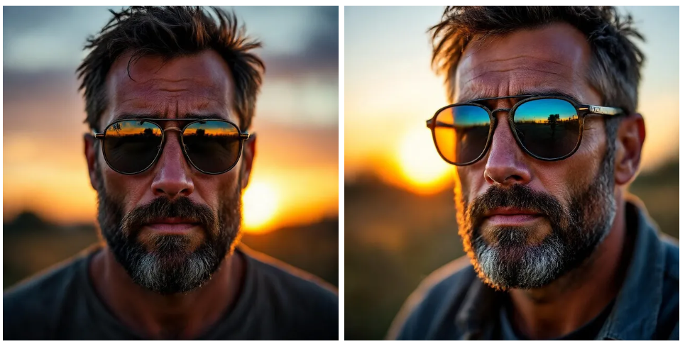 “夕陽下戴著反光墨鏡的男子超寫實特寫,需呈現(xiàn)細膩胡茬細節(jié)。”