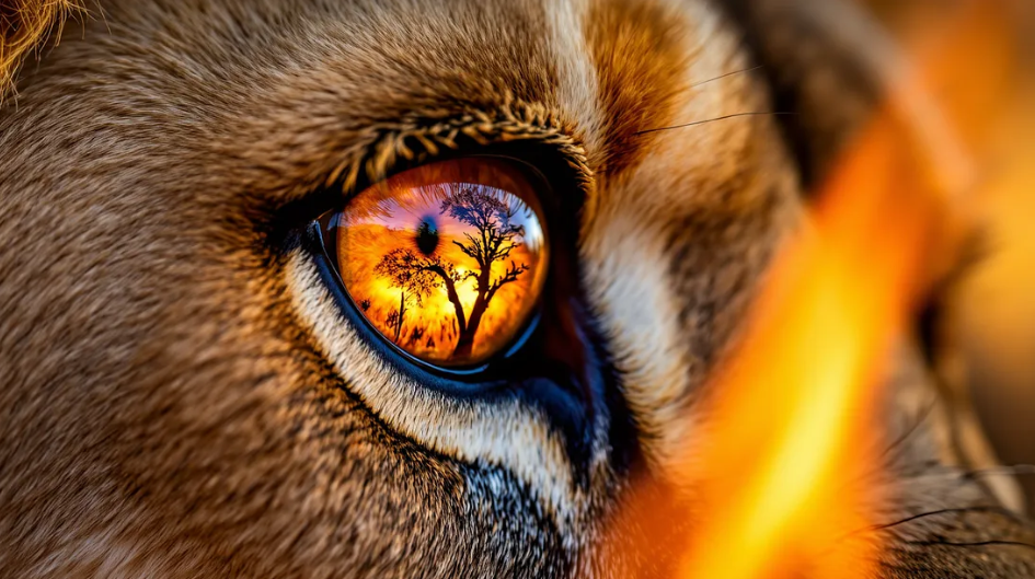 *《年邁雄獅之瞳:倒映燃燒草原的宏觀看,佳能RF 100mm f/2.8L鏡頭拍攝,自然柔光與淺景深交織》*