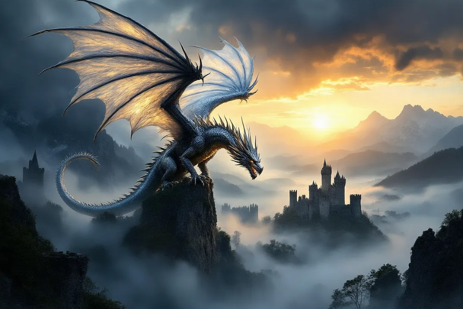 《霧靄山脈間翱翔的銀鱗巨龍,朝陽為古老城堡廢墟鍍上金芒》