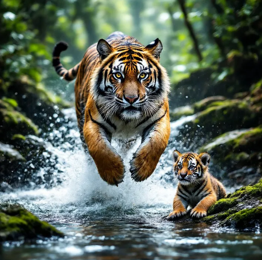 《孟加拉虎飛躍瀑布的瞬間:飛濺水珠凝固空中,幼虎在苔蘚河岸仰視——國家地理風(fēng)格》