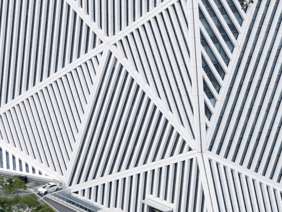 基座之上,230米的塔樓拔地而起,白色陶瓷條紋幕墻隨光線變幻閃爍。這一技術型立面消除了室內立柱需求,創造出全開放式辦公空間。條紋肌理呼應九牧模塊化生產理念,致敬企業前瞻性的制造哲學。塔樓的雕塑形態重新詮釋了中國當代城市擴張中的高層建筑范式,成為對周邊環境的直接回應。