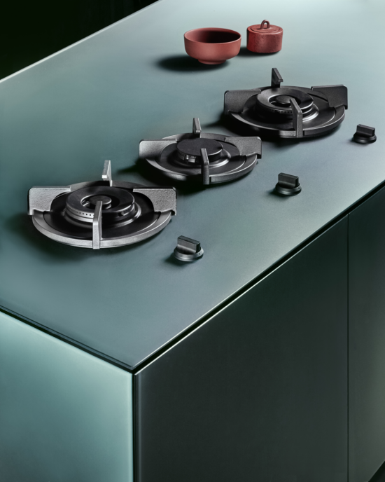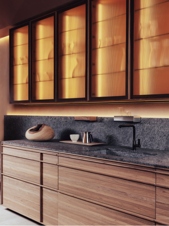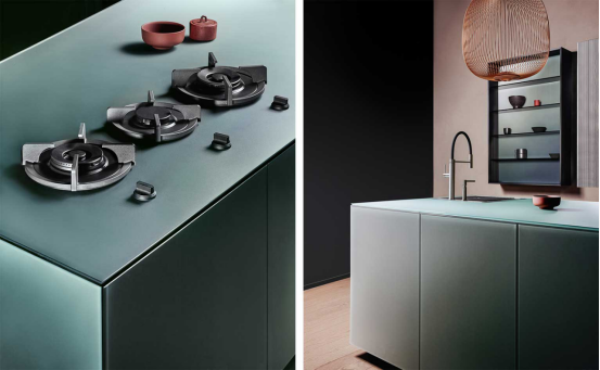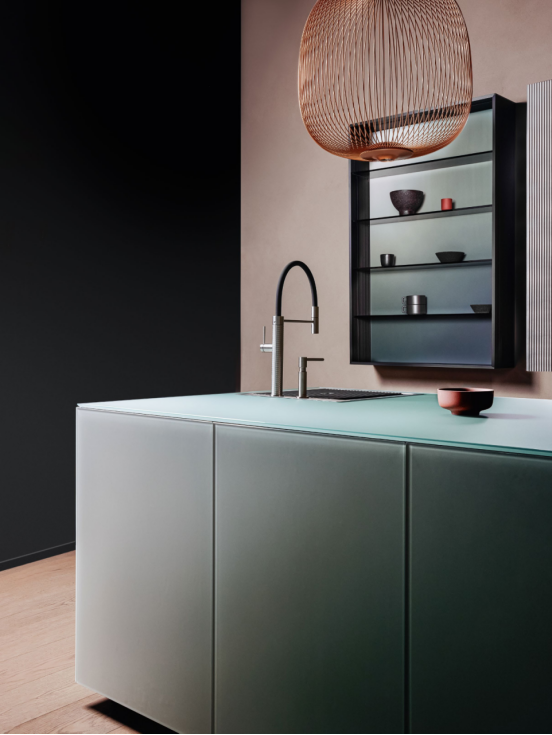盡管中性色調(diào)仍是廚房安全牌,但近年來越來越多設(shè)計師開始挑戰(zhàn)極簡配色方案。今年的明星產(chǎn)品當(dāng)屬Cesar研發(fā)部門推出的《N Elle》系列,圖中搭配的是西班牙García Cumini工作室極具魅力的"Nuance"玻璃材質(zhì)。這種如絲綢般柔滑的飾面靈感源自上世紀(jì)精致的玻璃工藝,既能呈現(xiàn)磨砂玻璃的流動質(zhì)感,又兼具透光性與深邃感。這種最初用于臺面的材質(zhì),現(xiàn)已可定制焦糖色、藍(lán)色、綠色與紅色版本。