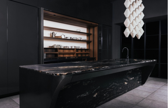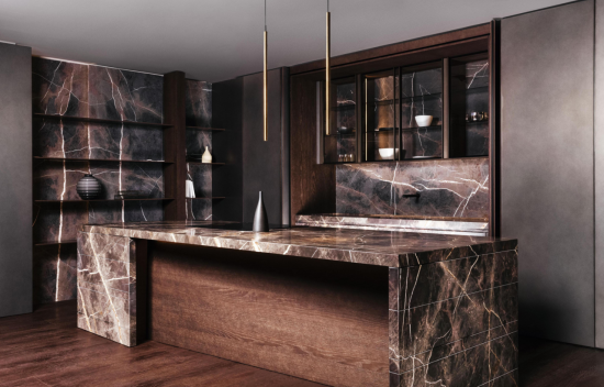 廚房中的大理石臺面正變得愈發(fā)大膽奪目。以Modulnova的《Blade Lab》為例——這個意大利品牌對新材料技術(shù)的潛心研究,造就了采用厚重撒哈拉棕大理石打造的臺面、柜體與背板。1.5厘米厚的柜門經(jīng)過鏤空減重處理更易開啟,搭配青銅粉塵涂層的玻璃鋁制柜體,而通高[書架]{.underline}則成為向生活區(qū)過渡的媒介。