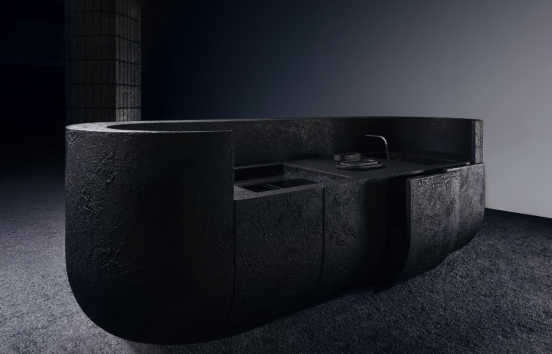 當(dāng)下正興起一股顛覆廚房材質(zhì)的風(fēng)潮,部分品牌在功能性空間中展開了前所未有的材質(zhì)實(shí)驗(yàn)。Henrytimi作為先鋒,將其系列稱為"功能性藝術(shù)品",優(yōu)先采用木材、石材等天然材質(zhì),打造兼具幾何純粹感與極簡美學(xué)的廚房。《Arca》系列采用黑陶與化石黑石鍛造,紋理起伏的弧形柜門內(nèi)藏著實(shí)用抽屜組,而抬高的背景墻既能遮擋雜亂,又可充當(dāng)吧臺。