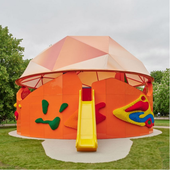 倫敦肯辛頓花園的蛇形畫廊年度夏季展亭向來是建筑實驗場,今年首度增設兒童展亭。英國建筑師彼得·庫克——1960年代前衛建筑團體Archigram的聯合創始人——為橙色波浪墻體加冕網格穹頂,延續其標志性的未來主義風格。