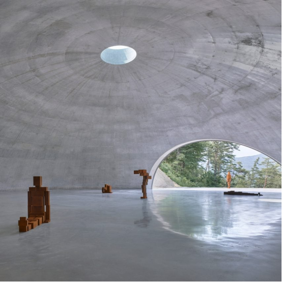 當倫敦的彩色展亭揭幕時,九千公里外的韓國原州,一座肅穆的混凝土穹頂建筑同期落成。日本建筑大師安藤忠雄為英國藝術家安東尼·葛姆雷的鑄鐵雕塑打造了這個洞穴般的永久展場,旨在挑戰"傳統白立方展覽模式"。
