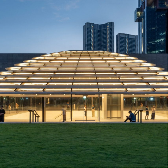 這座吉隆坡蘋果店顛覆了穹頂必須圓形的傳統認知。26.5米見方的玻璃穹頂"在方與圓之間無縫過渡",下方隱藏的零售空間配有遮陽百葉,抵御熱帶烈日。