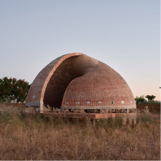 衢江畔的這座展館由穿孔鋼板與現澆混凝土構成,兩個半球體通過扭轉型墻體連接,營造出磚砌結構的視覺幻象。