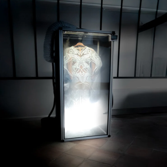 艾里斯·范·荷本(Iris van Herpen)與生物設(shè)計(jì)師克里斯·貝拉米(Chris Bellamy)聯(lián)手打造了一件由1.45億個(gè)生物發(fā)光微生物構(gòu)成的禮服。在登上T臺(tái)前,這件"活體高定"曾險(xiǎn)些夭折。
