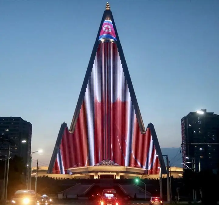 2018年,柳京飯店的建筑立面安裝上了LED燈,成為平壤最大的燈光秀平臺。